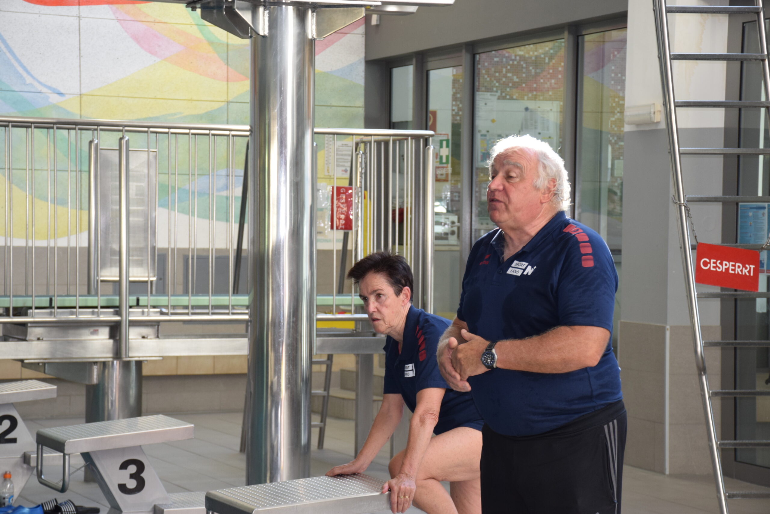 Schwimmwartin Ursula Manhart und Referent für Trainingsentwicklung Erich Neulinger schauen genau hin