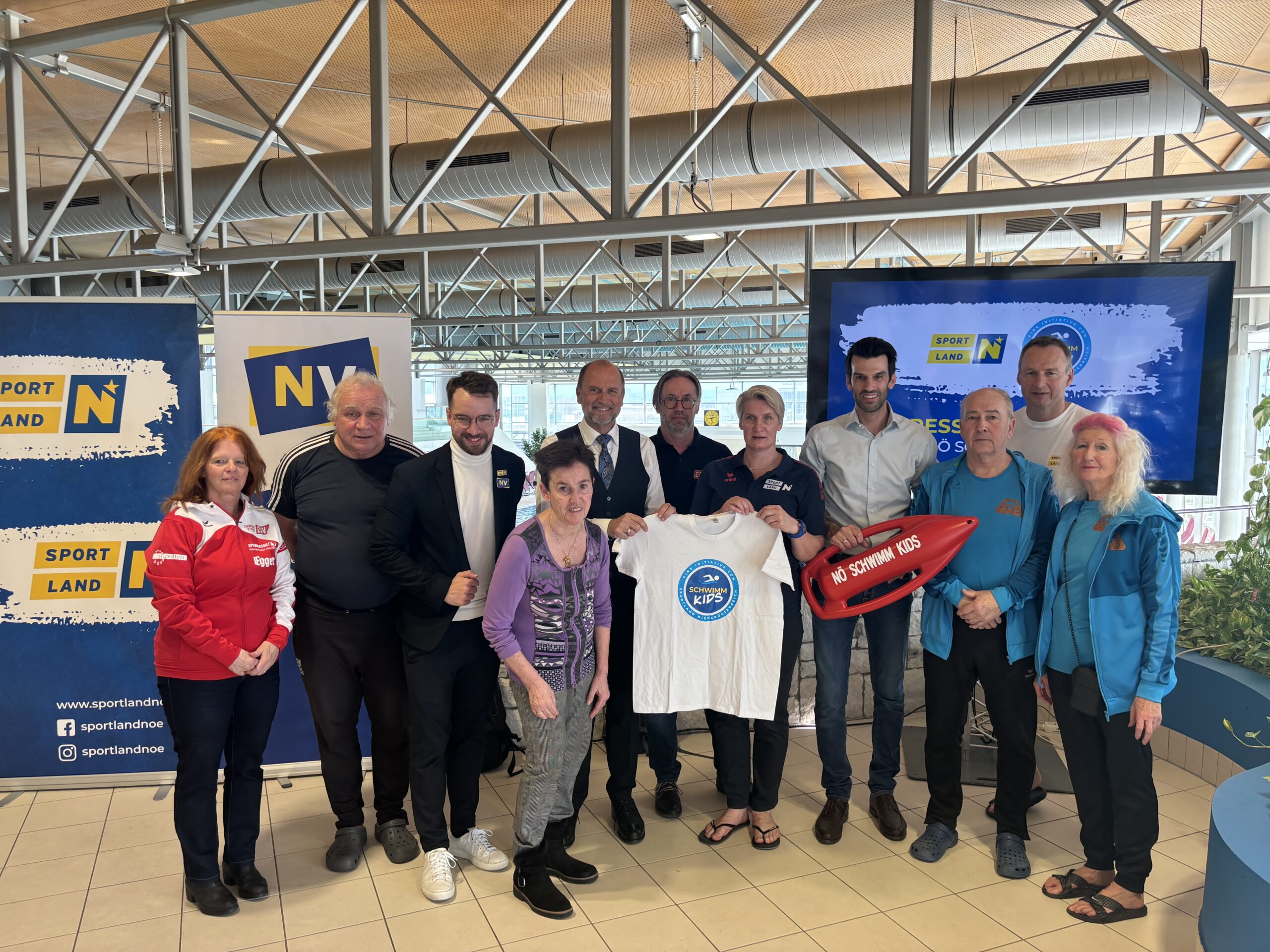 Präsentierten das Projekt: Mag. Bernhard Lackner (Vorstandsdirektor NV Versicherung), LH-Stellvertreter Udo Landbauer, Birgit Fürnkranz-Maglock (Präsidentin NÖ Landesverband im Schwimmen) (v.l) mit Schwimmkindern vom HSV Wr. Neustadt Auch Vereine des NÖ LVS waren vertreten: Sigrid Maier (ESV St. Pölten), Mag. Erich Neulinger (HSV Wr. Neustadt), Andreas Onea (Moderator), Ursula Manhart (SchwimmUNION Südstadt), Mag. Bernhard Lackner (Vorstandsdirektor NV Versicherung), Peter Maier (ESV St. Pölten), Birgit Fürnkranz-Maglock (Präsidentin NÖ Landesverband im Schwimmen), LH-Stellvertreter Udo Landbauer, Heinz Spannraft (SG ATV Allround Wr. Neustadt), Toni Pfeffer (Sportland NÖ) und Karin Vogt (v.l.)